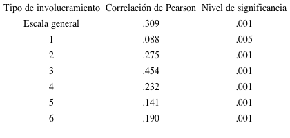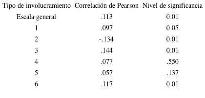 Al correlacionar la escala “nivel de involucramiento de los padres de familia” con el promedio de calificaciones, obtenemos .113 en la correlación de Pearson con un nivel de significancia de 0.01. En la tabla 17 mostramos los resultados cuando subdividimos la escala en los seis tipos de involucramiento. Es de resaltar que en los tipos 4 y 5 no hubo una correlación con significancia. Tanto en la escala general como en los tipos de involucramiento 1, 3 y 6 existe correlación positiva, es decir, mientras más actividades de involucramiento realizan los padres y las madres de familia, mejores calificaciones logran sus hijos. En el tipo de involucramiento 2, la correlación es negativa, es decir, mientras mejores calificaciones tienen los alumnos, menos se involucran los padres y las madres de familia en ese tipo de actividades (establecer comunicación entre la escuela y la familia), lo que significa que los padres y las madres de familia la utilizan como un recurso remedial. La correlación más alta fue la del tipo de involucramiento 3 (voluntariado). En ninguno de los casos la correlación es lo suficientemente fuerte como para generalizar los resultados. En los tipos de involucramiento 4 y 5 la correlación no fue significativa en términos estadísticos.