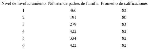Los resultados indican que los alumnos cuyos padres y madres se involucran en actividades de tipo 3 (voluntariado) tienden a tener mejores calificaciones que los alumnos cuyos padres y madres tienen otro tipo de involucramiento. Este involucramiento es el más visible, pues implica dedicar tiempo a estar en la escuela realizando alguna actividad; esto puede originar que el alumno perciba las actividades de la escuela como sustanciales para sus padres y entonces ellos mismos le dan importancia a sus labores escolares.