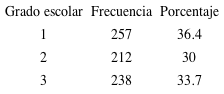 La muestra fue de 381 padres y madres de familia y se distribuyó de acuerdo con el grado y tipo de escuela en que estudian sus hijos; en cada caso se asignaron los porcentajes correspondientes de la población total. Los alumnos provinieron de grupos completos de escuelas elegidas y empleamos una tabla de números al azar. En total fueron 12 escuelas públicas (cuatro por cada grado) y seis privadas (dos por cada grado).