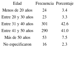 En cuanto al género de las personas que respondieron la encuesta, 79.6% (563) son mujeres y 14.6 (103) son hombres; 1.3 (9) no especificaron. Respecto a la edad de quienes respondieron la encuesta, 3.4% (24) tienen menos de veinte años; 3.3 (23), entre veinte y treinta años; 42.6 (301), entre treinta y uno y cuarenta años; 41% (290), entre cuarenta y uno y cincuenta años; y 7.5 (53), más de cincuenta años; 2.3 (16) no especificaron. Hubo personas menores de veinte años que respondieron la encuesta; se trató de hermanos de los alumnos (ver tabla 2).