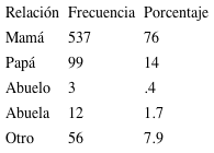 En la tabla 3 se puede observar la relación que tienen con los alumnos quienes contestan la encuesta: 76% (537) fueron respondidas por la madre; 14% (99), por el padre; .4% (3), por un abuelo; y 1.7% (12), por una abuela; 7.9 (56) de las personas que respondieron no especificaron qué relación tenían con el alumno.