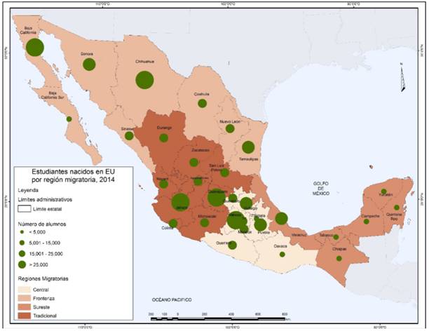 La región fronteriza ha tenido históricamente una participación significativa en la migración México-EUA, aunque de menor magnitud que la región tradicional. Los ocho estados que la componen son receptores de migrantes del interior del país y también, de manera importante, de migrantes que son devueltos por las autoridades migratorias estadounidenses (Conapo, 2012). Esta puede ser una de las razones de la mayor concentración de alumnos extranjeros en la región. Ante el aumento de deportaciones de connacionales desde EUA a partir de 2007, los estados fronterizos podrían estar fungiendo como receptores de familias enteras de migrantes, incluyendo a los hijos de mexicanos nacidos durante la experiencia migratoria. Estudios muestran que la geografía del retorno cambió al crear nuevos destinos para el regreso (Masferrer y Roberts, 2012); entre los factores que influyen la decisión de a dónde regresar están las oportunidades económicas y si el migrante es acompañado por el cónyuge e hijos, en cuyo caso la comunidad de origen no ofrecería de modo necesario condiciones favorables para la reintegración familiar.