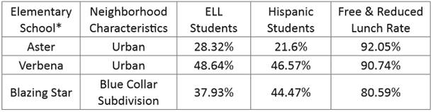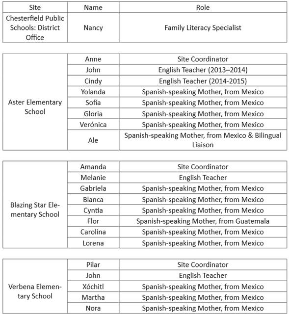 At the time of this study, CPS had family literacy programs at eight of their thirty-eight elementary schools and was in the process of establishing a ninth site: I conducted research at three elementary schools. In step with my focus on families in the New Latino Diaspora, two focus schools had the largest Latino population in the district; at the third site, Latino families were the minority but represented an accurate account of multiculturalism in Chesterfield’s neighborhoods. The demographic details of each of the three sites and the participating parents are presented in Tables 1 and 2. Pseudonyms have been used to denote the names of each school site and each participant throughout the study.