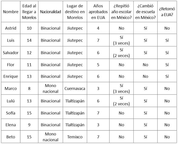 Los datos que presentamos a continuación son parte del primer estudio longitudinal y multisituado en México con estudiantes transnacionales. Como mencionamos, la investigación inició a finales de 2012, la cual dio seguimiento a diez niños y niñas que habían llegado recientemente de Estados Unidos al estado de Morelos, México. Para los fines de este artículo, partimos de dos preguntas: ¿cuáles son las trayectorias escolares de alumnos que iniciaron o que han cursado parte de su escolaridad en Estados Unidos y que se inscriben a escuelas en México?, y ¿cómo son las experiencias administrativas y escolares de los alumnos transnacionales, y sus familias, en las escuelas mexicanas? Dichas preguntas nos permiten compartir información sobre distintos momentos que hemos podido observar en las trayectorias escolares de los alumnos transnacionales en Morelos: trámites administrativos para ingresar a las escuelas mexicanas; rupturas pedagógicas y lingüísticas dentro del aula y la relación de los alumnos transnacionales con alumnos no-migrantes; abandono escolar temporal y regreso a la escuela en México o en Estados Unidos; y expectativas de movilidad escolar y laboral en el futuro de los alumnos transnacionales. Por lo tanto, el objetivo de este artículo es presentar, desde la perspectiva de los alumnos transnacionales, los retos administrativos, escolares y sociales que enfrentan cuando transitan entre un sistema escolar y otro.
