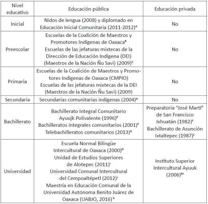 La educación comunitaria en Oaxaca se ha concretado en numerosas experiencias en todos los niveles educativos a partir de este siglo, como mostramos en la siguiente tabla.