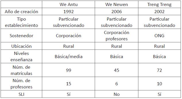 Las tres escuelas están ubicadas en diferentes sectores rurales de La Araucanía, región del sur de Chile, caracterizada por su alta tasa de ruralidad, población indígena mapuche y pobreza (Instituto Nacional de Estadística, 2002). Los tres establecimientos son de dependencia privada, pero cuentan con una subvención total del Estado, y su administración está a cargo de corporaciones privadas. Las tres también comparten el objetivo de ofrecer una “educación mapuche” o intercultural, pero desde una mirada mapuche, aunque presentan diferencias sustanciales respecto a cómo esta debiera llevarse a cabo. En este artículo, sin embargo, nos centramos en las similitudes entre ellas tanto en sus discursos como en sus prácticas.