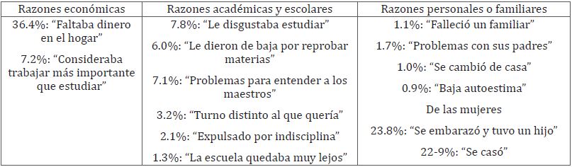 Por su parte, en la Encuesta Nacional de Juventud (Instituto Mexicano de la Juventud, 2010), 42.6% de los encuestados señalaron que el abandono escolar fue por causas escolares: a 15.9% “la escuela le aburría”, 13.1%, “no quiso estudiar” y 9.6%, “reprobó materias”.