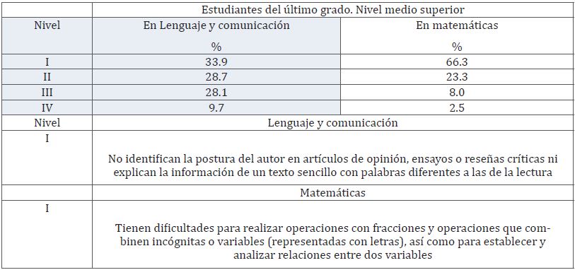 Diversas mediciones del aprendizaje, internacionales como el Programa para la Evaluación Internacional de Alumnos (PISA) y nacionales como el Plan Nacional de Evaluación de Aprendizajes (Planea), muestran que los alumnos de bachillerato no logran los aprendizajes de este nivel escolar. Los resultados del Planea (INEE, 2017b) revelan que la mitad de los estudiantes del último año de la educación media superior solo logran el nivel más bajo de la medición (nivel I) y quedan incluso por debajo del nivel de los estándares de la educación básica.