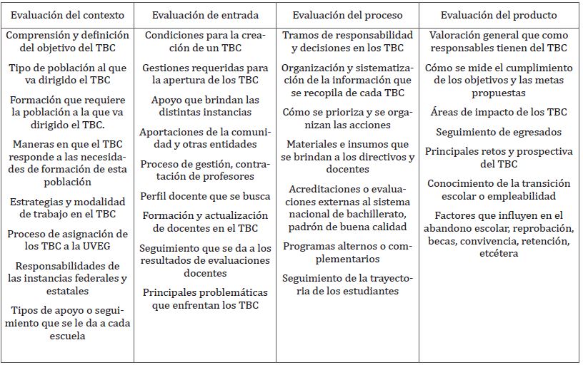Cada etapa anterior, si bien no es lineal, sí requiere un momento específico para su realización. En nuestro estudio, las dos primeras se abordan desde el análisis de los documentos y toda la planeación con la que ya se puede contar y que proviene de las instituciones responsables, como la Secretaría de Educación Pública y la Subsecretaría de Educación Media Superior (SEP-SEMS), además de las consultas con los propios responsables de los TBC en Guanajuato, de la revisión de los recursos humanos y materiales para enfrentar las acciones, de la viabilidad y coherencia de lo planteado. Es, en general, una evaluación sobre el diseño, el contenido y las estrategias formativas planeadas en esta modalidad educativa, así como la comprensión de los conceptos básicos que la guían. Las dos siguientes -evaluación del proceso y del producto- se atienden desde el trabajo de campo, el contraste de lo planeado con el desarrollo e implementación, y la valoración de los actores.