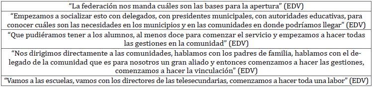 Anteriormente era el esquema de que el estudiante fuera a cabecera [del municipio] o a alguna comunidad más grande, donde había instalaciones educativas, y ahora no, el esquema es vamos a la comunidad con nuestros tres profesores a las instalaciones de telesecundaria, salvo a algunas excepciones donde nos hemos instalado en casas ejidales, en alguna primaria, porque la circunstancia, la infraestructura no era la idónea, había casos en que las escuelas estaban casi cayéndose o la telesecundaria estaba abandonada (EDEM).