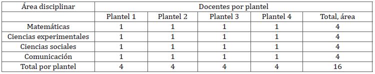 Por cada una de las áreas disciplinarias básicas consideradas en la RIEMS (matemáticas, ciencias experimentales, ciencias sociales y comunicación) del tronco de formación básica del Conalep, solicitamos a los directivos poder entrevistar a un docente por área en cada plantel (ver Tabla).