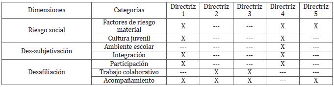 Desde una visión más analítica, fundamentada en los conceptos planteados en el apartado teórico de este trabajo (ver Tabla 3), las dimensiones más atendidas por las directrices son el riesgo social y la desafiliación. La primera se recupera en las directrices 1, 4 y 5, en las que destaca la atención a un tema muy poco abordado por las políticas públicas, como lo es la cultura juvenil. Las directrices 2 y 3 se concentran en la dimensión de desafiliación con base en el fortalecimiento de capacidades y habilidades de docentes y tutores académicos; esto, con la finalidad de generar procesos de seguimiento y acompañamiento para incentivar la integración académica y social.