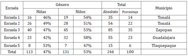 La unidad de observación fueron los estudiantes de sexto grado en cinco escuelas públicas ubicadas en diferentes zonas geográficas con diverso contexto económico y social; al final, obtuvimos una muestra de 244 niños entre once y catorce años (ver Tabla 1).
