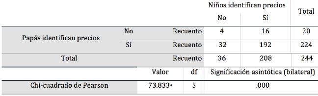 Como advertimos en la Tabla 2, la hipótesis nula es rechazada: la significancia de la prueba (P=0.000 ≤ 0.05), siendo inferior al valor de α (0.05), revela que las enseñanzas acerca de los precios se perciben como una acción observada de sus padres.