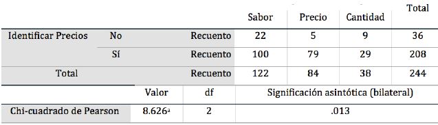 Hipótesis nula: El hecho de que el niño se fije en precios es independiente de sus preferencias entre sabor, precio y cantidad a la hora de comprar.