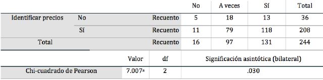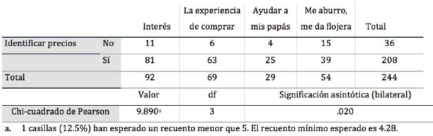 El rechazo de la hipótesis nula nos da evidencia de que no es independiente el fijarse en los precios y el motivo para acompañar a los padres en las compras. Esta prueba nos sugiere la posibilidad de que el niño vive, en general, una experiencia satisfactoria al participar en las actividades de compras con sus padres. La Tabla de contingencia 5 engloba intereses específicos, como que los papás les compren “algo”, “es divertido tener el carrito del súper” y “ver juguetes”. Este es el resultado de una pregunta abierta acerca de los motivos que tienen los infantes para acompañar a sus padres en las compras, y que todo ha sido incluido en el apartado de interés.