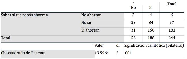 Al rechazar la hipótesis nula, de acuerdo con la Tabla de contingencia 6 (chi-cuadrado = 13.596; P= 0.001) advertimos que los niños tienen presente el concepto de ahorro como una estructura del conocimiento que hacen propio al momento que ellos deciden ahorrar. Aunado a esto, 57 niños no tienen conocimiento del comportamiento de sus padres hacia el ahorro, que es cercano al número de niños que no ahorran (56). No obstante, 31 niños saben que sus padres sí ahorran y ellos no lo hacen.