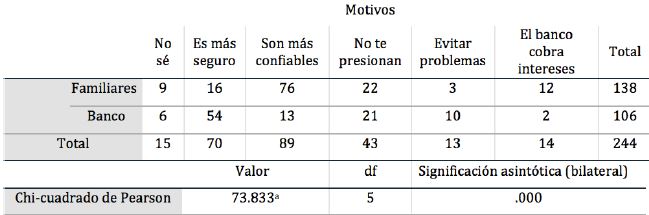 Hipótesis nula: El hecho de que el niño identifique dos alternativas para pedir dinero prestado es independiente de los motivos por los cuales reconoce a la familia y al banco como las mejores opciones.