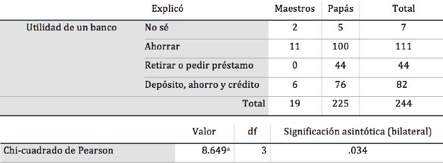 La Tabla de contingencia 8 nos muestra que, de 244 niños, solo siete no tienen conocimiento de la utilidad de un banco; sin embargo, es evidente que estos obtienen su estructura de conocimiento en gran medida de sus papas; en cambio, los maestros alcanzan una mínima proporción que denota la ausencia de información sobre temas económicos en la escuela. Por tal motivo, consideramos que la reforma educativa puede impactar positivamente en la educación financiera de los niños.