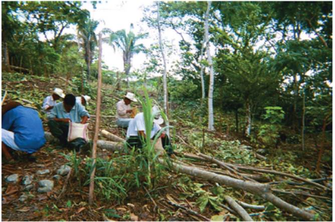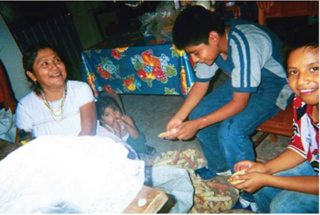 Esta imagen ilustra cómo el medio familiar de Marcos está fuertemente vinculado con el medio laboral, ya que muchas de las tareas requieren la cooperación de mujeres, hombres y niños en un mismo espacio y tiempo.