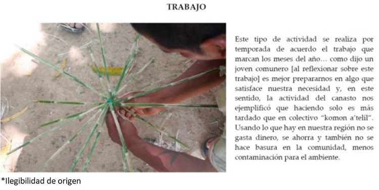 El siguiente es un ejemplo de una fotovoz elaborada por uno de los educadores comunitarios que colaboran en el proyecto. Se trata de una secuencia de fotografías de una actividad con recursos que regala la milpa, en este caso, la elaboración de canastos de caña brava. Cada fotografía de la secuencia corresponde a un eje de la sintaxis cultural.