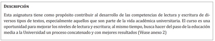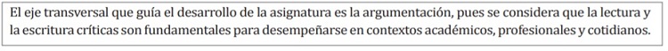 Esta asignatura tiene como propósito contribuir al desarrollo de las competencias de lectura y escritura de diversos tipos de textos, especialmente aquellos que son parte de la vida académica universitaria. El curso es una oportunidad para mejorar los niveles de lectura y escritura; al mismo tiempo, busca hacer del paso de la educación media a la Universidad un proceso concatenado y con mejores resultados. El eje transversal que guía el desarrollo de la asignatura es la argumentación, pues se considera que la lectura y la escritura críticas son fundamentales para desempeñarse en contextos académicos, profesionales y cotidianos. Por otra parte, el desarrollo de este curso se fundamenta en el trabajo colaborativo y autónomo. Por lo tanto, es esencial la relación entre las actividades realizadas en el aula con el docente (presencial), las asesorías brindadas por el grupo de apoyo a los estudiantes de lectoescritura, el trabajo en grupos (colaborativo) y el trabajo independiente (individual).