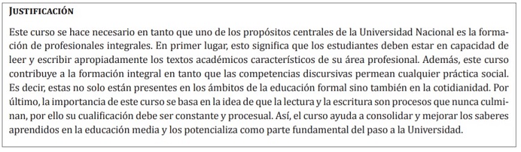Este curso se hace necesario en tanto que uno de los propósitos centrales de la Universidad Nacional es la formación de profesionales integrales. En primer lugar, esto significa que los estudiantes deben estar en capacidad de leer y escribir apropiadamente los textos académicos característicos de su área profesional. Además, este curso contribuye a la formación integral en tanto que las competencias discursivas permean cualquier práctica social. Es decir, estas no solo están presentes en los ámbitos de la educación formal sino también en la cotidianidad. Por último, la importancia de este curso se basa en la idea de que la lectura y la escritura son procesos que nunca culminan, por ello su cualificación debe ser constante y procesual. Así, el curso ayuda a consolidar y mejorar los saberes aprendidos en la educación media y los potencializa como parte fundamental del paso a la Universidad.
