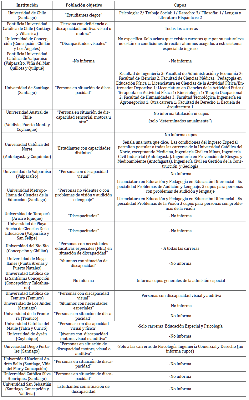En la tabla 1 (ver al final del documento) se presentan las universidades que, a septiembre de 2017, declararon contar con procesos de admisión especial para personas con discapacidad (DEMRE, 2017); señalaron si esta admisión pone condiciones según el tipo de discapacidad y si las bases para postular están disponibles en los portales.