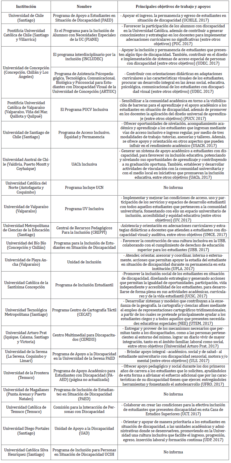 La tabla 2 (ver al final del documento) fue elaborada a partir de la revisión de los portales institucionales de las 39 universidades que se adscribieron al proceso de admisión regular 2018, y de la consulta del boletín oficial número 4 del DEMRE, que reglamenta el proceso de admisión regular 2018 (DEMRE, 2017). La tabla ofrece información sobre la presencia de programas institucionales para apoyar la permanencia de personas con discapacidad, junto con sus respectivas declaraciones de objetivos de trabajo y público a quien está dirigido.