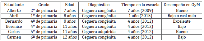 La muestra de nuestro estudio se conformó de seis estudiantes de la Escuela para Niñas y Niños Ciegos de Guadalajara, AC, tres niñas y tres niños: Alberto, Abril, Bernardo, Berenice, Carlos y Carmen (sus nombres fueron cambiados por los motivos éticos de la investigación). La mitad de ellos muestran alta y la otra mitad baja habilidad para trasladarse. Respecto al grado escolar, dos de ellos estaban en los primeros grados de primaria (1º. y 2º.), dos en intermedios (3º. y 4º.) y el resto en avanzados (5º. y 6º.).