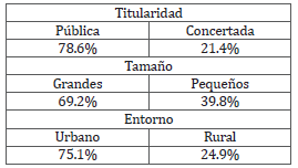 Hemos recogido información procedente de 89 centros educativos; de ellos, el 78.6% son centros públicos y el 21.4%, centros concertados. Según el tamaño, el 69.2% son centros grandes con más de 10 unidades, mientras que el 39.8%, centros pequeños; según el entorno, el 75.1% están ubicados en un entorno urbano y el 24.9%, en uno rural. Estos datos se muestran en la tabla 1.