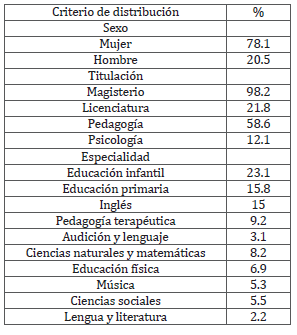 De los encuestados, el 98.2% son diplomados en magisterio y el 21.8%, licenciados. Los maestros se adscriben a las siguientes especialidades: Educación infantil (23.1%), Educación primaria (15.8%), Inglés (15%), Pedagogía terapéutica (9.2%), Audición y lenguaje (3.1%), Ciencias naturales y matemáticas (8.2%), Educación física (6.9%), Música (5.3%), Ciencias sociales (5.5%) y Lengua y literatura (2.2%). De los licenciados, el 58.6% lo son en Pedagogía y el 12.1%, en Psicología.