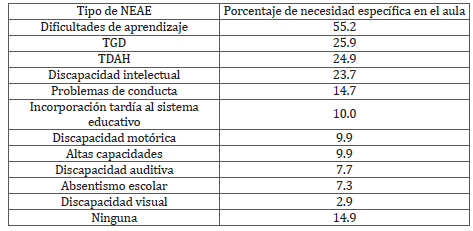Del total de datos obtenidos del cuestionario, hemos seleccionado los más relevantes que dan respuesta a los objetivos formulados en este artículo. En la tabla 3 observamos que más del 90% del profesorado encuestado tiene en su aula alumnado con NEAE y las necesidades específicas más recurrentes son las relacionadas con dificultades de aprendizaje (55.2%), seguida por TGD (25.9%), TDAH (24.9%) y discapacidad intelectual (23.7%).