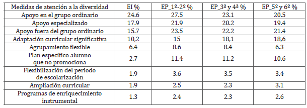 Atendiendo al primer objetivo formulado en esta investigación, las medidas de atención a la diversidad aplicadas en los centros varían en función de la etapa educativa. En educación infantil, son el apoyo en grupo ordinario y el apoyo especializado; el primero es de los más productivos según diferentes estudios (Pijl & Frostad, 2010; Koster, Timmerman & Nakken, 2009). No obstante, no existe en España un consenso al respecto de las políticas de apoyo en los centros (Sandoval, Simón y Echeita, 2012).