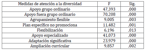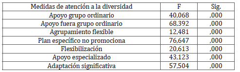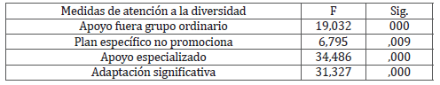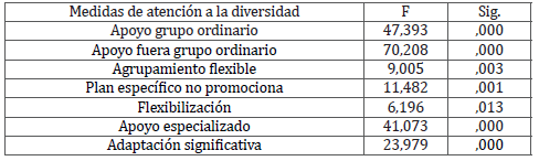 Los resultados de la tabla 5 indican que existen diferencias significativas entre las dificultades de aprendizaje y las siguientes medidas de atención a la diversidad: apoyo en el grupo ordinario (), apoyo fuera del grupo ordinario ( ), agrupamiento flexible (), plan personalizado para el alumnado que no promociona ( ), flexibilización del periodo de escolarización ( ), apoyo especializado (), adaptación curricular significativa ( ).