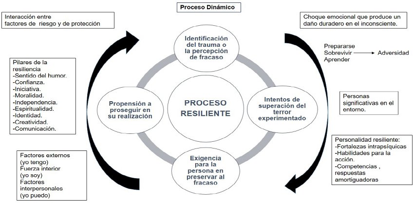 Para comprender el proceso resiliente, la persona dispone de habilidades y destrezas que se revelan en la afectividad; en la capacidad para establecer conexiones profundas con otros seres humanos; en la creatividad, el sentido del humor y la iniciativa para realizar acciones significativas, como el altruismo, o bien, en la autonomía para afrontar circunstancias de vida, además de una identidad cultural que transita a la comunidad, es decir, se ve como un proceso que se enriquece con la interacción con otros e impacta en cada una de las personas con las que se convive (Puig y Rubio, 2011). Aquí, los factores de riesgo y protección hacen su contrapeso como una balanza; esto es, entre el traumatismo y la oportunidad, estos factores positivos se imponen, y la capacidad de equilibrar fuerzas favorecerá el acercamiento a la resiliencia (Delage, 2010).