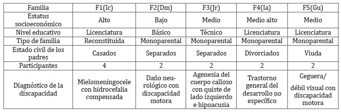 Las familias entrevistadas tenían en común un hijo o hija diagnosticada con una discapacidad determinada desde su nacimiento, que, en el momento de la investigación, se encontraba en la etapa evolutiva de la infancia. En todas las familias, los hermanos/as no diagnosticados estaban a cargo de actividades de cuidado, responsabilidades en hogar y colaboración con las madres. Cuatro de las familias eran monoparentales, y no a causa de la experiencia de la discapacidad; todas habían estado en centros externos de apoyo profesional. Asimismo, en estas familias, las madres eran las responsables en todos los sentidos, desde el económico, laboral y social.