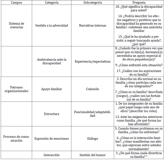 Para la obtención de los datos de los informantes, diseñamos una entrevista en profundidad, semiestructurada y con un total de 17 preguntas. La guía de entrevista fue sometida a juico de cuatro expertos, lo cual permitió organizar y adecuar el contenido en una ficha de identificación con datos generales, el diagnóstico del hijo/a o hermano/a con discapacidad y el total de preguntas. Posteriormente, de las 17, seleccionamos 13 preguntas clave, con el propósito de contar con las voces de la población participante, es decir, los miembros del grupo familiar relacionados con el hijo/a o hermano/a con discapacidad. Este proceso se organizó de la siguiente manera: determinamos los campos generales de Walsh (2004), de los cuales surgieron seis categorías y ocho subcategorías para el análisis. La construcción de las fases anteriores se presentan en la tabla 2.