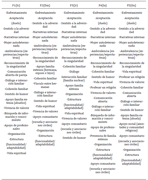 Los integrantes de las familias reportaron una serie de aspectos que aportan a la construcción de la resiliencia, integrados en un conjunto de acciones de enfrentamiento, aceptación, sentido a la adversidad, narrativas, figuras femeninas autoderterminadas, ambivalencia de sensaciones y reconocimiento a la singularidad del otro, que los han enriquecido poco a poco para adaptarse a la discapacidad y los ha fortalecido en lo individual y en lo grupal durante el proceso.