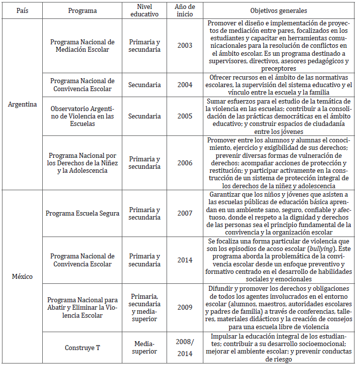 Por otra parte, en el país sureño, los programas y las políticas estatales estuvieron enfocados al nivel medio (que tiene una extensión de cinco o seis años según la jurisdicción), mientras que en el país del norte la atención estuvo puesta en la educación básica, en particular en el nivel primario, aunque en los últimos años avanzó hasta el nivel secundario. En cambio, la educación media superior -con una duración de tres años- recibió una menor atención en este tema; por ejemplo, el programa más amplio para este nivel, el Construye T, aborda de manera tangencial la problemática de la violencia, en tanto su objetivo principal es minimizar el abandono escolar.