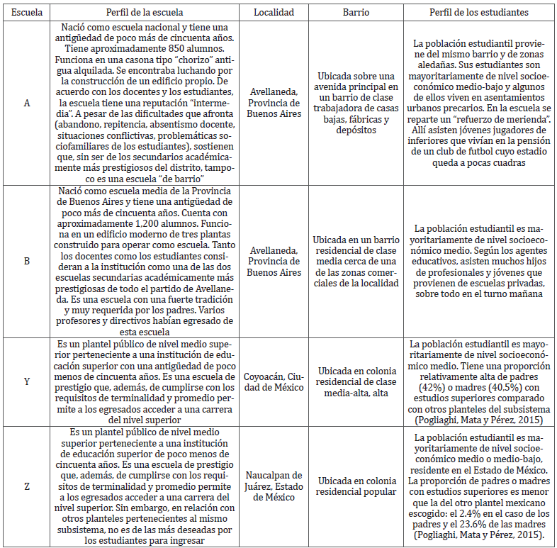 Una de las investigaciones fue llevada a cabo en el área metropolitana de Buenos Aires (Argentina), entre 2012 y 2015; la otra, en la zona metropolitana del Valle de México (México) durante 2015 y 2018. En ambos países, escogimos de modo intencional dos escuelas (planteles) públicas de niveles educativos equivalentes. En el caso de la provincia de Buenos Aires, que cuenta con un nivel medio -denominado secundario- de seis años, trabajamos con los últimos tres grados que conforman el ciclo superior, los cuales se corresponden con los de la educación media superior en México. Cabe destacar que con este tipo de muestra no pretendemos generalizar en términos probabilísticos los resultados obtenidos, sino aportar a la comprensión profunda del problema de investigación (Hernández, Fernández y Baptista, 2010).