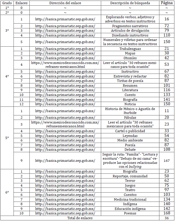 Destaca la ausencia de enlaces dispuestos para apoyar el desarrollo de los contenidos basados en la tecnología en la asignatura de matemáticas en los seis grados de educación primaria. El libro de texto de primaria de esa materia solo habilita el formato en PDF como parte de la innovación en materia de las tecnologías de la información y la comunicación (TIC). Por ello, en adelante, los resultados se centrarán en los hallazgos de la asignatura de español.