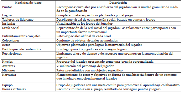 La aplicación exitosa de las mecánicas de juego depende de una estrategia didáctica de gamificación bien diseñada, construida con base en un adecuado entendimiento del participante, su misión y la motivación que lo impulsa. La tabla 2 recopila las mecánicas de juego asociadas más comúnmente a la gamificación con el entendido de que pueden ser aplicadas de forma individual o combinada.