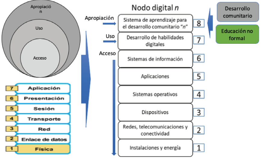 En nuestra propuesta del nodo digital para el desarrollo comunitario seguimos el proceso siguiente (ver figura 3): primero, realizamos la adecuación del modelo OSI a uno por capas, que hiciera posible el ofrecimiento de servicios computacionales educativos; segundo, afinamos el número de capas y su denominación considerando los componentes progresivos de la apropiación digital; y tercero, agregamos la capa 8, destinada al sistema de aprendizaje no formal, que se expresa a partir del modelo de educación no formal y del desarrollo comunitario (componentes descriptivos y de desarrollo comunitario) para asegurar la pertinencia.