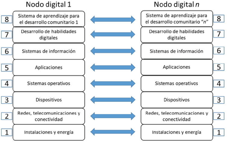 El modelo conceptual de nodo digital para el desarrollo comunitario pretende ser un marco de trabajo interdisciplinario en los campos básicos de lo social, pedagógico y computacional; los niveles 1 al 6 corresponden a la práctica informática; el nivel 7 atiende el enlace tecnológico-pedagógico para el desarrollo de habilidades digitales necesarias; y el 8 amalgama el enfoque pedagógico-social para proponer el modelo educativo no formal en el contexto del desarrollo comunitario. La implementación de sistemas y ambientes educativos mediados por tecnología requiere este tipo de perspectivas multidisciplinarias; lo anterior, en virtud de impulsar a los profesionales y expertos para la intersección en los campos del conocimiento sociológico, pedagógico y computacional. Por ello, el fundamento teórico del modelo conceptual proviene de la complementariedad del desarrollo comunitario, la educación no formal, la apropiación tecnológica y el modelo de interconexión de sistemas computacionales.