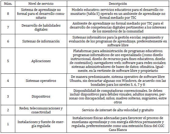 En la tabla 4 mostramos la aplicación del modelo conceptual de nodo digital para el desarrollo comunitario en el contexto del CGC Casa Blanca.