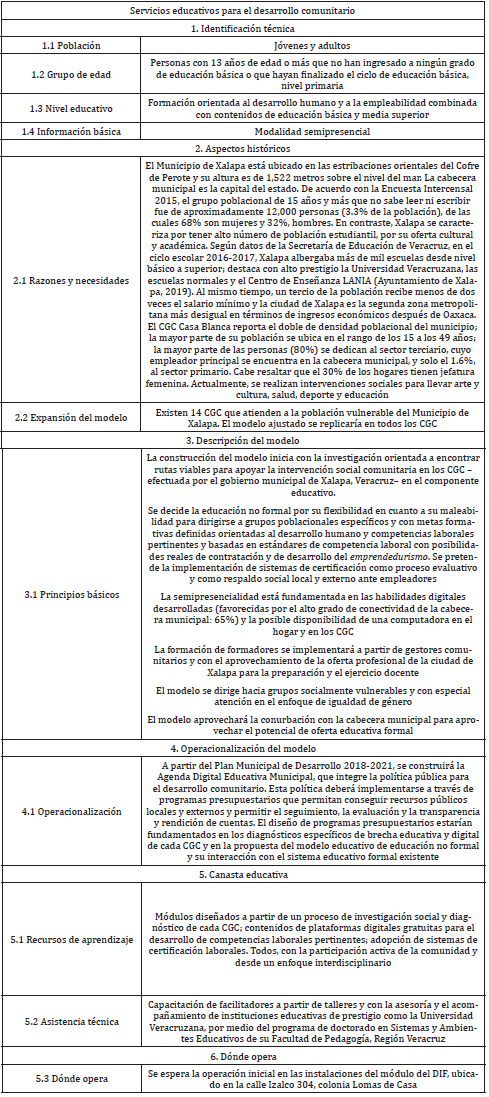 Para fundamentar la viabilidad de la propuesta, recurrimos al caso de uno de los centros de gestión comunitaria (CGC) identificado como Casa Blanca del Ayuntamiento de Xalapa, en el estado de Veracruz, México. En primera instancia, tomamos los resultados preliminares del diagnóstico comunitario del CGC Casa Blanca en las vertientes de desarrollo social y de brecha digital reportados; posteriormente, analizamos la utilidad del modelo conceptual de nodo digital de educación no formal para el desarrollo comunitario.