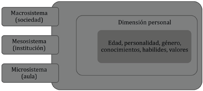 Las autoras de este artículo consideramos que la participación, en todas sus expresiones, es la base de la convivencia y, al mismo tiempo, es un elemento indispensable para la formación de la ciudadanía. Así, proponemos para el análisis de la convivencia una perspectiva que hemos denominado ecológica, siguiendo a Bronfenbrenner (1979), en la que establecemos dos dimensiones para su estudio: la personal, que incluiría los elementos psicológicos, la edad y el género, y la institucional, integrada por tres subsistemas: macrosocial (contexto), mesosocial (institución) y microsocial (aula) (ver figura 1).