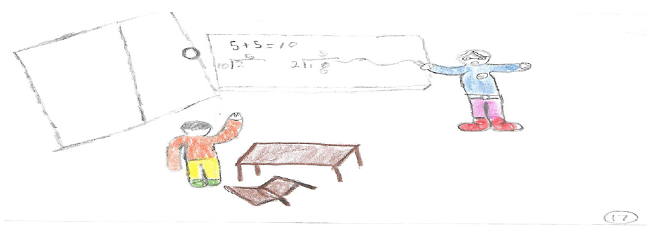 Las siguientes escenas que se presentaron en mayor proporción fueron aquellas que, a partir del análisis de contenido, denominamos canónicas. Estas producciones son las que ilustran una forma de participación que es privilegiada en el ámbito escolar. Si relacionamos estas escenas con las anteriores, podemos afirmar que sus producciones gráficas dan cuenta de que, para estos estudiantes, la participación está relacionada con una participación en la que los adultos dirigen y los estudiantes, para expresarse o emitir una opinión, deben seguir cánones establecidos por la institución. Lay-Lisboa et al. (2018) señalan que, en la escuela, el protagonismo infantil se desarrolla en el espacio intra-aula de manera academicista, como lo muestran las siguientes producciones gráficas.