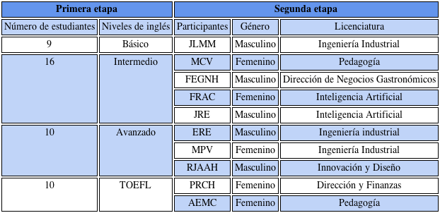 A partir del análisis de los videos, seleccionamos a diez estudiantes para participar en la segunda etapa de la investigación, cuyo objetivo era profundizar en las experiencias narradas para examinar el significado que le otorgaban y conocer los factores que los impulsaban a superar los obstáculos del aprendizaje del inglés. Los datos de los participantes de la primera y segunda etapa se muestran en la tabla.